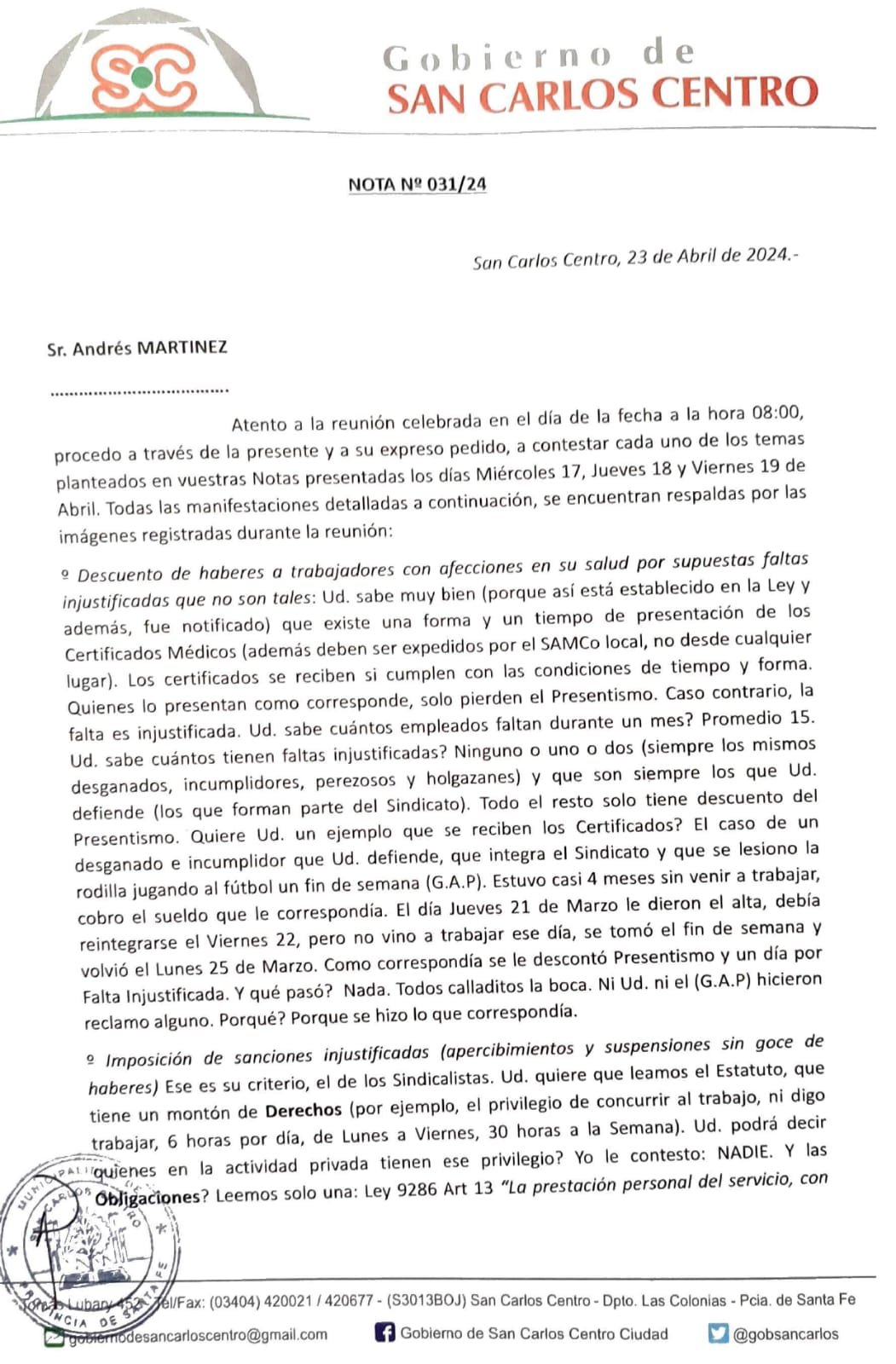 Es por ello, que en la misma tarde de ayer, siendo las 18:20 hs. Martínez recibió la Nota Nº 031/24, que se transcribe a continuación para conocimiento de la comunidad.
