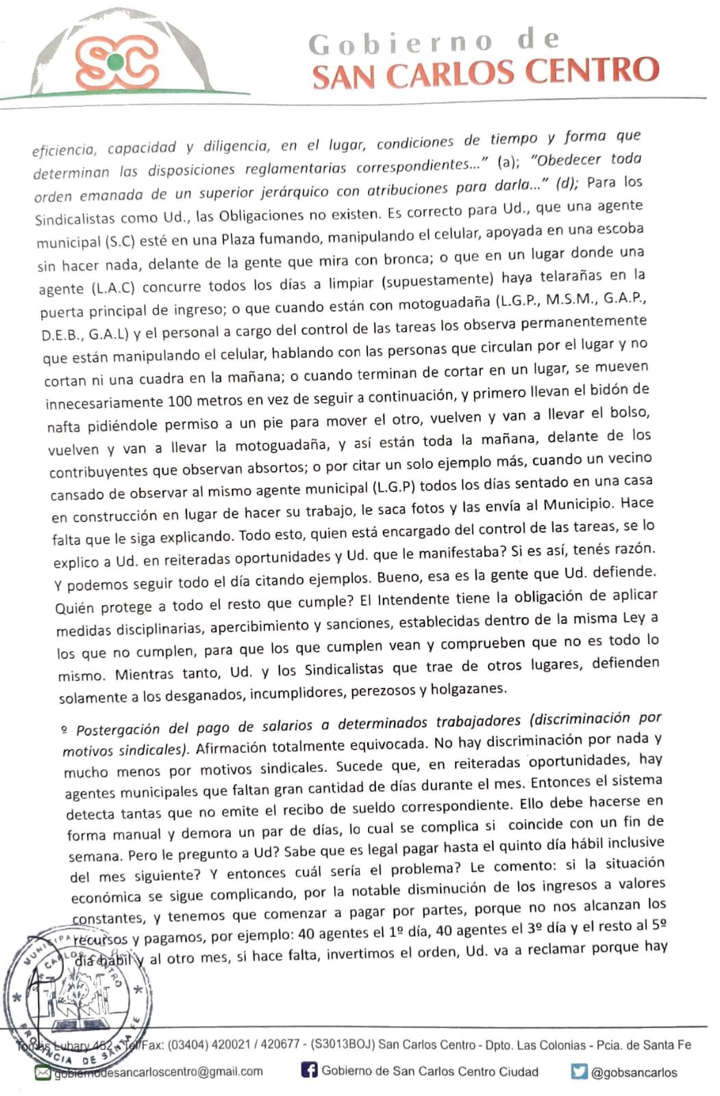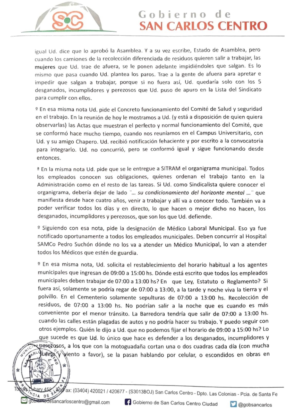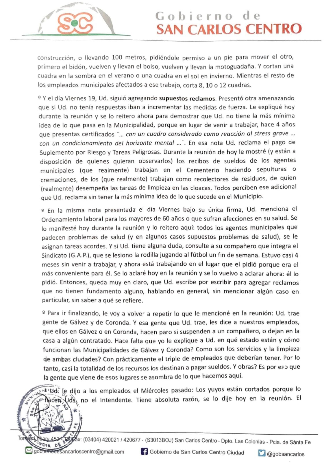 º Y el día Viernes 19, Ud. siguió agregando supuestos reclamos. Presentó otra nota amenazando que si Ud. no tenía respuestas iban a incrementar las medidas de fuerza. Le expliqué hoy durante la reunión y se lo reitero ahora para demostrar que Ud. no tiene la más mínima idea de lo que pasa en la Municipalidad, porque en lugar de venir a trabajar, hace 4 años que presentás certificados ¨… con un cuadro considerado como reacción al stress grave … con un condicionamiento del horizonte mental …¨. En esa nota Ud. reclama el pago de Suplemento por Riesgo y Tareas Peligrosas. Durante la reunión de hoy le mostré (y están a disposición de quienes quieran observarlos) los recibos de sueldos de los agentes municipales (que realmente) trabajan en el Cementerio haciendo sepulturas o cremaciones, de los (que realmente) trabajan como recolectores de residuos, de quien (realmente) desempeña las tareas de limpieza en las cloacas. Todos perciben ese adicional que Ud. reclama sin tener la más mínima idea de lo que sucede en el Municipio.