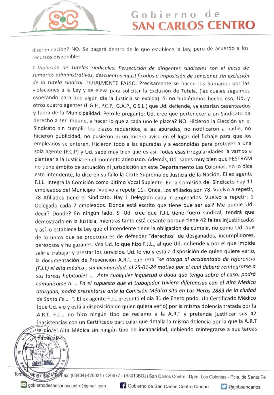 º Violación de Tutelas Sindicales. Persecución de dirigentes sindicales con el inicio de sumarios administrativos, descuentos injustificados e imposición de sanciones sin exclusión de la tutela sindical. TOTALMENTE FALSO. Precisamente se hacen los Sumarios por las violaciones a la Ley y se eleva para solicitar la Exclusión de Tutela, (las cuales seguimos esperando para que algún día la Justicia se expida). Si no hubiéramos hecho eso, Ud. y otros cuatro agentes (L.G.P., P.C.P., G.A.P., G.S.L.) que Ud. defiende, ya estarían cesanteados y fuera de la Municipalidad. Pero le pregunto: Ud. cree que pertenecer a un Sindicato da derecho a ser impune, a hacer lo que a cada uno le plazca? NO. Hicieron la Elección en el Sindicato sin cumplir los plazos requeridos, a las apuradas, no notificaron a nadie, no hicieron publicidad, no pusieron ni un mísero aviso en el lugar del fichaje para que los empleados se enteren. Hicieron todo a las apuradas y a escondidas para proteger a una sola agente (P.C.P) y Ud. sabe muy bien que es así. Todas esas irregularidades las vamos a plantear a la Justicia en el momento adecuado. Además, Ud. sabe muy bien que FESTRAM no tiene ámbito de actuación ni jurisdicción en este Departamento Las Colonias, no lo dice este Intendente, lo dice en su fallo la Corte Suprema de Justicia de la Nación. El ex agente F.J.L. integra la Comisión como último Vocal Suplente. En la Comisión del Sindicato hay 11 empleados del Municipio. Vuelvo a repetir 11 (Once). Los afiliados son 78. Vuelvo a repetir, 78 Afiliados tiene el Sindicato. Hay 1 Delegado cada 7 empleados. Vuelvo a repetir: 1 Delegado cada 7 empleados. Dónde está escrito que tiene que ser así? Me puede Ud. decir? Dónde? En ningún lado. Si Ud. cree que F.J.L tiene fuero sindical, tendrá que demostrarlo en la Justicia, mientras tanto está cesante porque tiene 42 faltas injustificadas y así lo establece la Ley que el Intendente tiene la obligación de cumplir, no como Ud. que de lo único que se preocupa es de defender ¨derechos¨ de desganados, incumplidores, perezosos y holgazanes. Vea Ud. lo que hizo F.J.L., al que Ud. defiende y por el que impide salir a trabajar y prestar los servicios. Ud. lo vio y está a disposición de quien quiera verlo, la documentación de Prevención A.R.T. que reza ¨se otorga al accidentado de referencia (F.J.L) el alta médica , sin incapacidad, al 25-01-24 motivo por el cual deberá reintegrarse a sus tareas habituales … .Ante cualquier inquietud o duda que tenga sobre el caso, podrá comunicarse a … En el supuesto que el trabajador tuviera diferencias con el Alta Médica otorgada, podrá presentarse ante la Comisión Médica sita en Las Heras 2883 de la ciudad de Santa Fe … ¨. El ex agente F.J.L presentó el día 31 de Enero ppdo. un Certificado Médico (que Ud. vio y está a disposición de quien quiera verlo) por la misma dolencia tratada por la A.R.T. F.J.L. no hizo ningún tipo de reclamo a la A.R.T y pretende justificar sus 42 inasistencias con un Certificado particular que detalla la misma dolencia por la que la A.R.T le dio el Alta Médica sin ningún tipo de incapacidad, debiendo reintegrarse a sus tareas habituales.