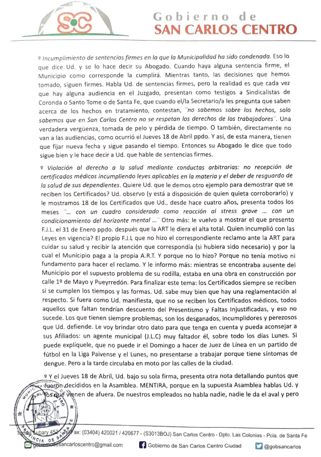 º Incumplimiento de sentencias firmes en las que la Municipalidad ha sido condenada. Eso es lo que dice Ud. y se lo hace decir su Abogado. Cuando haya alguna sentencia firme, el Municipio como corresponde la cumplirá. Mientras tanto, las decisiones que hemos tomado, siguen firmes. Habla Ud. de sentencias firmes, pero la realidad es que cada vez que hay alguna audiencia en el Juzgado, presentan como testigos a Sindicalistas de Coronda o Santo Tomé o de Santa Fe, que cuando el/la Secretario/a les pregunta qué saben acerca de los hechos en tratamiento, contestan, ¨no sabemos sobre los hechos, solo sabemos que en San Carlos Centro no se respetan los derechos de los trabajadores¨. Una verdadera vergüenza, tomada de pelo y pérdida de tiempo. O también, directamente no van a las audiencias, como ocurrió el Jueves 18 de Abril ppdo. Y así, de esta manera, tienen que fijar nueva fecha y sigue pasando el tiempo. Entonces su Abogado le dice que todo sigue bien y le hace decir a Ud. que hable de sentencias firmes.