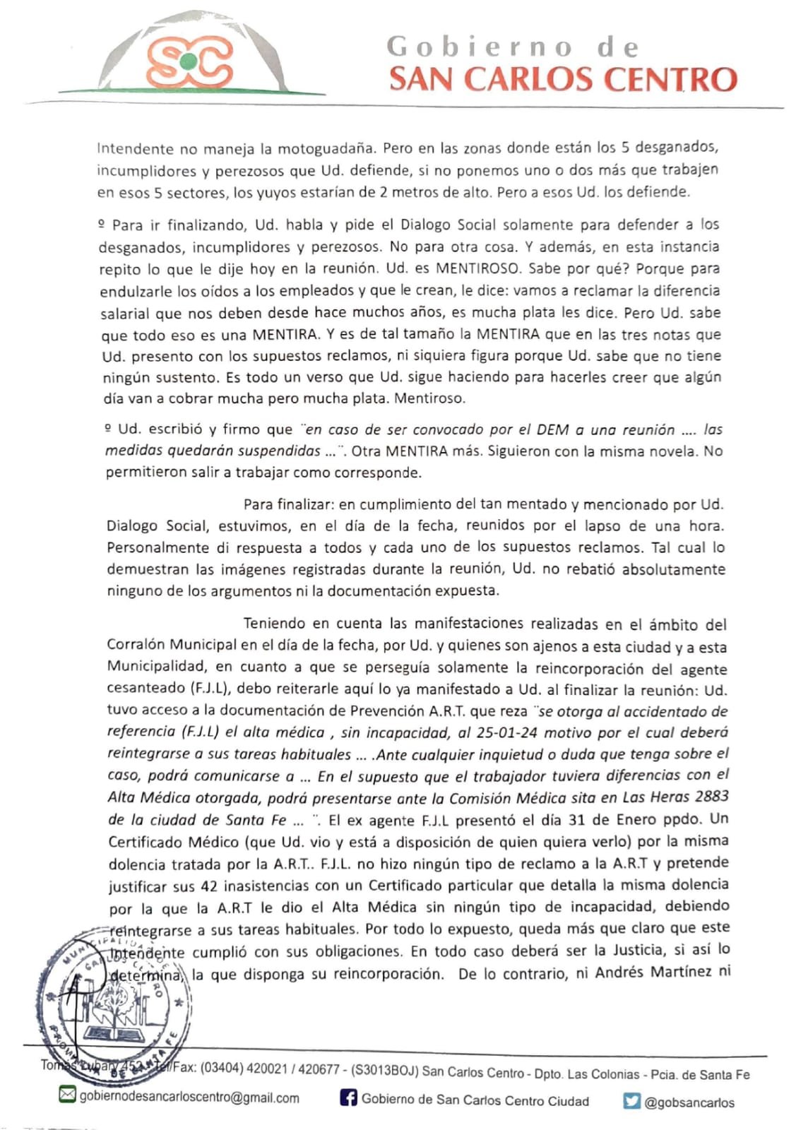 Teniendo en cuenta las manifestaciones realizadas en el ámbito del Corralón Municipal en el día de la fecha, por Ud. y quienes son ajenos a esta ciudad y a esta Municipalidad, en cuanto a que se perseguía solamente la reincorporación del agente cesanteado (F.J.L), debo reiterarle aquí lo ya manifestado a Ud. al finalizar la reunión: Ud. tuvo acceso a la documentación de Prevención A.R.T. que reza ¨se otorga al accidentado de referencia (F.J.L) el alta médica , sin incapacidad, al 25-01-24 motivo por el cual deberá reintegrarse a sus tareas habituales … .Ante cualquier inquietud o duda que tenga sobre el caso, podrá comunicarse a … En el supuesto que el trabajador tuviera diferencias con el Alta Médica otorgada, podrá presentarse ante la Comisión Médica sita en Las Heras 2883 de la ciudad de Santa Fe … ¨. El ex agente F.J.L presentó el día 31 de Enero ppdo. un Certificado Médico (que Ud. vio y está a disposición de quien quiera verlo) por la misma dolencia tratada por la A.R.T.. F.J.L. no hizo ningún tipo de reclamo a la A.R.T y pretende justificar sus 42 inasistencias con un Certificado particular que detalla la misma dolencia por la que la A.R.T le dio el Alta Médica sin ningún tipo de incapacidad, debiendo reintegrarse a sus tareas habituales. Por todo lo expuesto, queda más que claro que este Intendente cumplió con sus obligaciones. En todo caso deberá ser la Justicia, si así lo determina, la que disponga su reincorporación. De lo contrario, ni Andrés Martínez ni otros Sindicalistas que son totalmente ajenos a esta Municipalidad y a nuestra ciudad, podrán decidir o dictaminar al respecto.