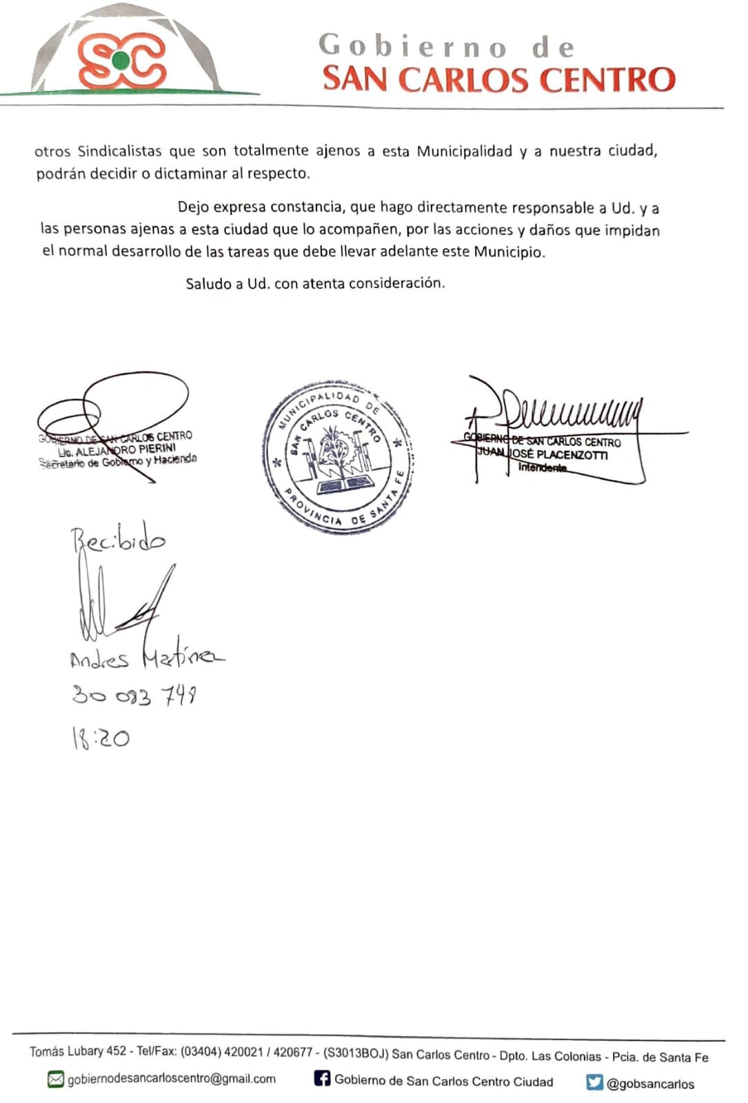 Al finalizar, Martínez le solicitó al Intendente Placenzotti que todas las respuestas y manifestaciones expresadas durante el encuentro, le fueran entregadas por escrito para poder presentarlas a sus compañeros, puesto que caso contrario, los mismos no le iban a creer.