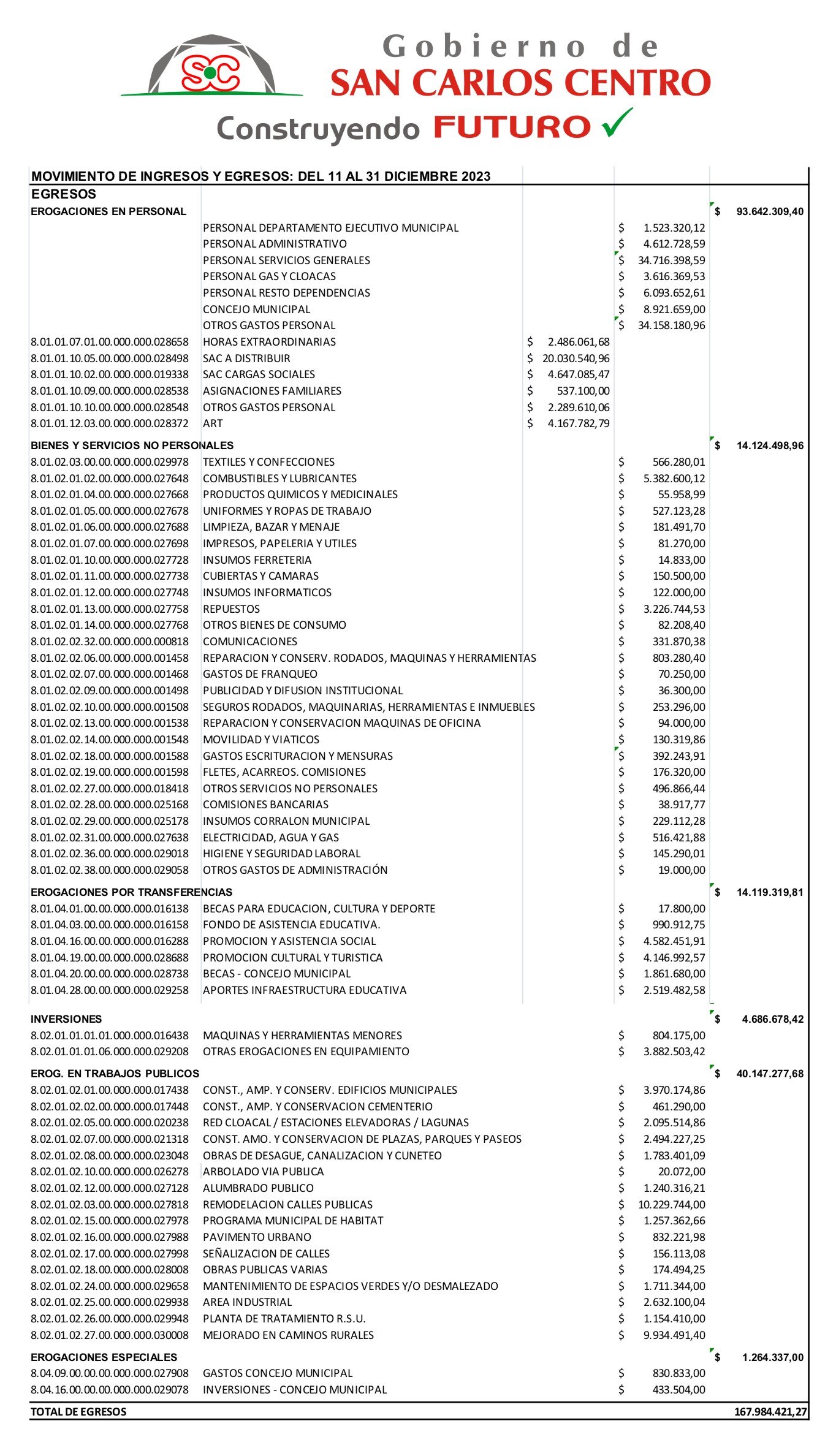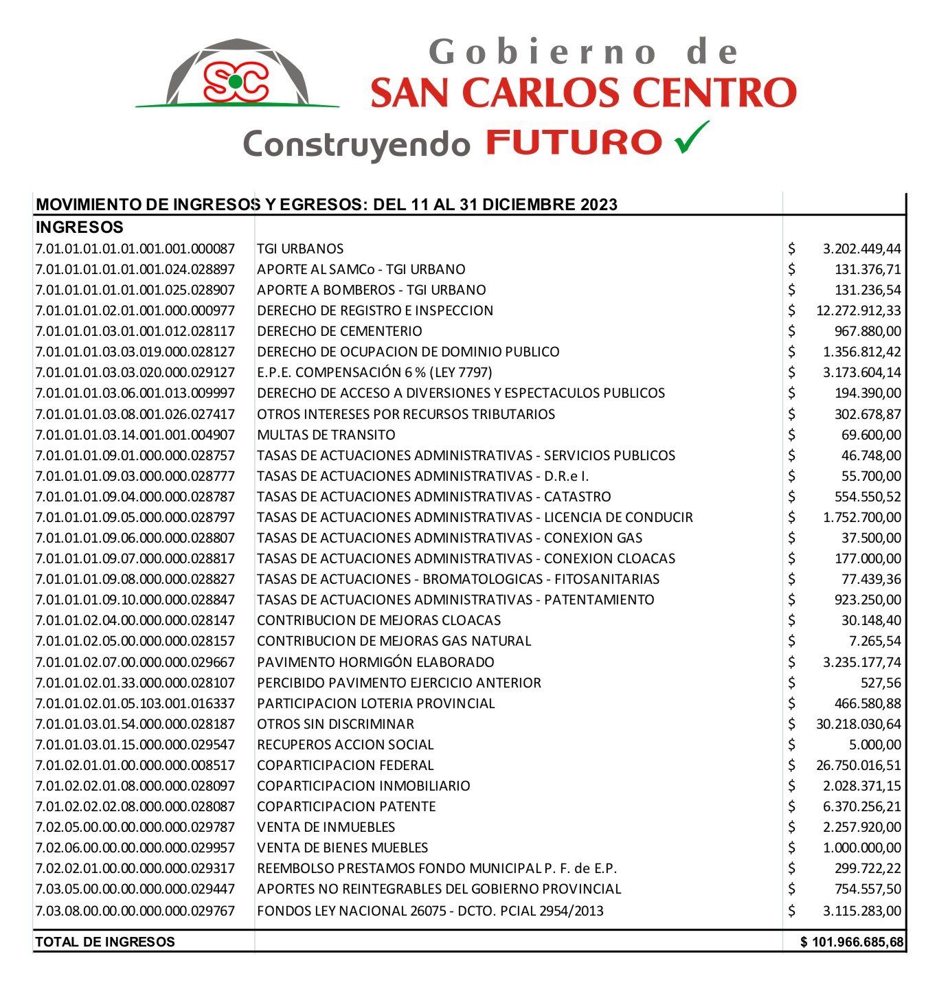 MOVIMIENTO INGRESOS Y EGRESOS DEL 11 AL 31 DE DICIEMBRE 2023